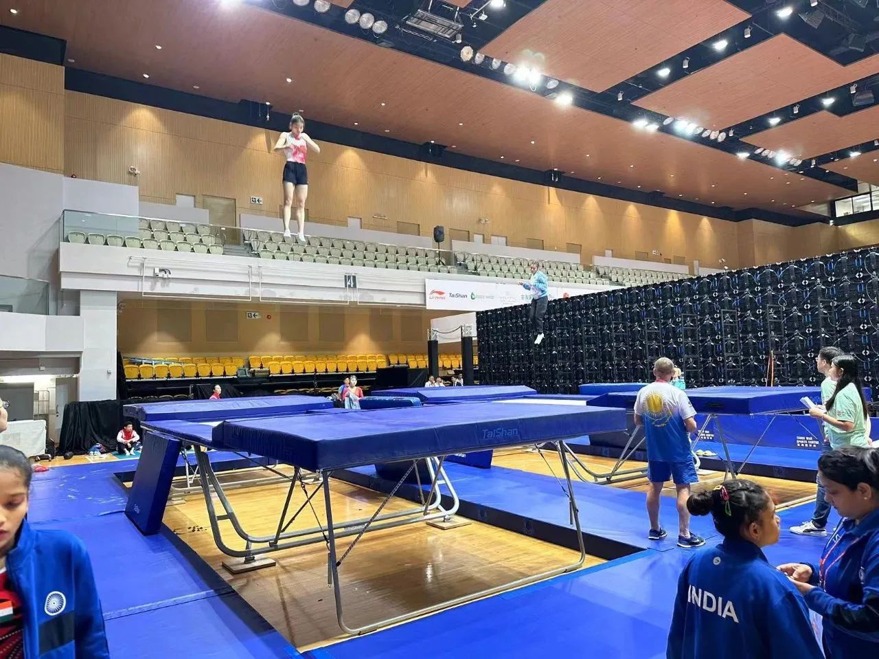 為服務好本屆蹦床錦標賽,6686體育保障人員嚴格按照賽事服務手冊開展工作,從場館的規(guī)劃布局、器材的安裝調(diào)試、標準高度的校準、過程巡檢等各個環(huán)節(jié),一絲不茍、嚴謹細致,確保蹦床器材安裝的準確無誤,始終踐行國際賽場上的中國標準,見證6686體育全領域規(guī)劃、設計、制造、集成、運營、服務一站式解決方案的發(fā)展理念。